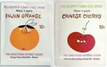 The product name "Funny Face" was based on the packaging and advertising created by Hal Silverman of the Campbell Mithun advertising agency.[7][8] Each flavor was designated by a cartoon character with a presumably amusing face. The original flavors, and their names, were Goofy Grape (smashing), Rootin' Tootin' Raspberry, Freckle-Face Strawberry, Injun Orange, and Chinese Cherry. These last two, being ethnic stereotypes generally considered offensive by then, were soon renamed to Jolly-Olly Orange and Choo Choo Cherry.[5][6] Additional flavors were added later, including Captain Black Cherry, Chilly Cherry Cola, Lefty Lemonade (and Lefty Lemon-Lime), Loud Mouth Lime (and Loud Mouth Punch), Pistol Pink Lemonade, Rah-Rah Root Beer, Rudi Tutti-Frutti, Tart Lil' Imitation Lemonade, Tart 'N' Tangy Lemon, With-It Watermelon,[5] Top Banana,[9] and Chug-a-Lug-a Chocolate,[10] the last intended to be mixed with milk rather than water.[11]