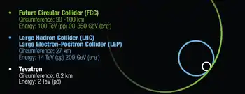The Future Circular Collider (FCC) is a proposed post-LHC particle accelerator with an energy significantly above that of previous circular colliders (SPS, Tevatron, LHC).[1][2] The FCC project examines scenarios for three different types of particle collisions: hadron (proton–proton and heavy ion) collisions in a collider design known as FCC-hh, electron–positron collisions in a collider design known as FCC-ee, and proton–electron collisions in a collider design known as FCC-eh.[3]