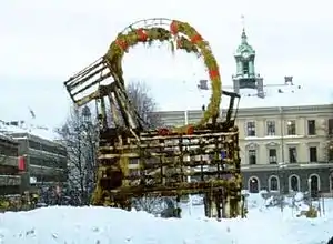 The Gävle Goat (Swedish: Gävlebocken, Swedish pronunciation: [ˈjɛ̌ːvlɛbɔkːɛn]) is a traditional Christmas display erected annually at Slottstorget (Castle Square) in central Gävle, Sweden. It is a giant version of a traditional Swedish Yule Goat figure made of straw. It is erected each year by local community groups at the beginning of Advent over a period of two days.[1][2] It has been the subject of repeated arson attacks, and, despite security measures and a nearby fire station, the goat has been burned to the ground most years since its first appearance in 1966. As of December 2021, 38 out of 56 goats have been destroyed or damaged in some way. Burning or destroying the goat in some way is illegal, and the Svea Court of Appeal has stated that the offence should normally carry a 3-month prison sentence; in 2018, it sentenced a 27-year-old man to a suspended sentence and day fines for aggravated property damage for burning the goat.[3]
