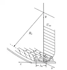 In fluid dynamics, Görtler vortices are secondary flows that appear in a boundary layer flow along a concave wall. If the boundary layer is thin compared to the radius of curvature of the wall, the pressure remains constant across the boundary layer. On the other hand, if the boundary layer thickness is comparable to the radius of curvature, the centrifugal action creates a pressure variation across the boundary layer. This leads to the centrifugal instability (Görtler instability) of the boundary layer and consequent formation of Görtler vortices.