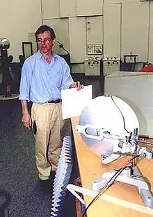 ![]() Nimtz showing elements of his double prism experiment in the labs of the University of Koblenz. | |