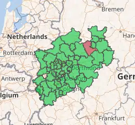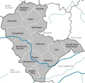 Gütersloh (German pronunciation: [ˈɡyːtɐsloː]) is a Kreis (district) in the north-east of North Rhine-Westphalia, Germany. Neighboring districts are Osnabrück, Herford, district-free Bielefeld, Lippe, Paderborn, Soest and Warendorf.