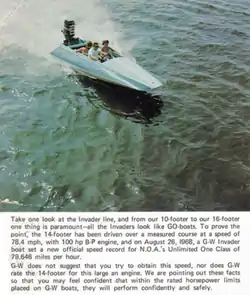 G-W Invader, (sometimes listed as GW Invader), began production in 1967 with its 10-foot and 16-foot boats. The "G-W" indicated the last names of the founders. The initial designs of 10 and 16 footers were that of sport racing boats with a very low profile, low weight, and shallow draft. The Invader hulls and decks were constructed of fiberglass over a wood structure or frame. Models were available in a variety of colors as well as unique color combinations at an added cost to the customer. G-W went on to increase the models and styles of boats. Arnie Gray sold his portion of G-W Invader boat factory to George Wooldridge before he moved to Tampa, Florida where he lived until he died in 1997. Transfer of ownership after sale to Mr. Wooldridge has been mentioned but not substantiated. Roger Harmon bought the company in 1985, and later sold it in 1995 to a Muncie, Indiana-based investment firm. G-W Invader expanded and moved into a new factory in Tipton, Indiana in 1993, a building formerly occupied by Pioneer Hi-Bred.[1] Shortly after the expansion, they filed bankruptcy. G-W Invader ceased production of boats after 1997.