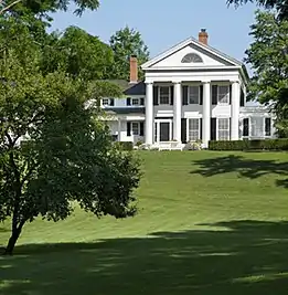 The simple exterior shapes, ambience and details of the Colonial Revival Willow Grace Farm (Millbrook, New York, 2007) were modeled after a nearby dilapidated, loosely Federal-style dwelling its client had purchased; the 9,000-square-foot residence and outbuildings incorporate wide-plank floorboards, door hinges, beams and fixtures salvaged from the older structure alongside elements detailed to match.[53][54][55] New Classical House (Hudson Valley, 2007) blends Jeffersonian palladian classical precedents and regional Greek Revival elements in a five-part symmetrical design with a contemporary interior layout in a palette of teals, blues, and greens.[56][57]