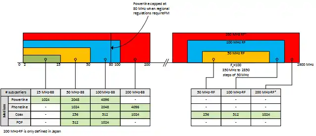 - OFDM Carrier Spacing: 195.31 kHz in coaxial, 48.82 kHz in phone lines, 24.41 kHz in power lines.
