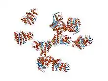 In molecular biology, the GHMP kinase family is a family of kinase enzymes. Members of this family include homoserine kinases EC 2.7.1.39, galactokinases EC 2.7.1.6, and mevalonate kinasesEC 2.7.1.36. These kinases make up the GHMP kinase superfamily of ATP-dependent enzymes.[1] These enzymes are involved in the biosynthesis of isoprenes and amino acids as well as in carbohydrate metabolism. These enzymes contain, in their N-terminal section, a conserved Gly/Ser-rich region which is probably involved in the binding of ATP.[2][3] The C-terminal domain of homoserine kinase has a central alpha-beta plait fold and an insertion of four helices, which, together with the N-terminal fold, creates a novel nucleotide binding fold.[4]