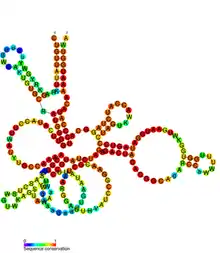 The Lariat capping ribozyme (formerly called GIR1 branching ribozyme) is a ~180 nt ribozyme with an apparent resemblance to a group I ribozyme.[1] It is found within a complex type of group I introns also termed twin-ribozyme introns.[2] Rather than splicing, it catalyses a branching reaction in which the 2'OH of an internal residue is involved in a nucleophilic attack at a nearby phosphodiester bond.[3] As a result, the RNA is cleaved at an internal processing site (IPS), leaving a 3'OH and a downstream product with a 3 nt lariat at its 5' end. The lariat has the first and the third nucleotide joined by a 2',5' phosphodiester bond and is referred to as 'the lariat cap' because it caps an intron-encoded mRNA. The resulting lariat cap seems to contribute by increasing the half-life of the HE mRNA,[3][4] thus conferring an evolutionary advantage to the HE.