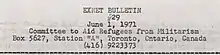 There was one other short-lived case of a GI underground paper getting permission to conduct antiwar activity on a military base. The staff of the well named Where Are We? out of Fort Huachuca in Arizona requested and received permission to gather signatures on an antiwar petition on the base. They even set up tables in front of the main base exchange, or retail store, where in one day, July 31, 1971, they gathered 540 signatures, including "143 Vietnam veterans and twenty-three officers." That was the end of that—the base command never let them do it again.[11]: 86