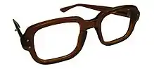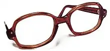 In the late 1970s, the lens shape was re-designed to the "S9". Black "S9" frames were released for a brief period,[2] before brown cellulose acetate replaced the black. The brown cellulose acetate frames were discontinued in 2012, and a new smaller unisex lens shape, the "5A", was introduced, with a black frame. The modern "5A" shape was designed by Rochester Optical, who is the exclusive manufacturer of the R-5A frame.[3]