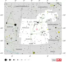 GK Persei (also Nova Persei 1901) was a bright nova first observed on Earth in 1901. It was discovered by Thomas David Anderson, an Edinburgh clergyman, at 02:40 UT on 22 February 1901 when it was at magnitude 2.7.[9][10] It reached a maximum magnitude of 0.2, the brightest nova of modern times until Nova Aquilae 1918. After fading into obscurity at about magnitude 12 to 13 during the early 20th century, GK Persei began displaying infrequent outbursts of 2 to 3 magnitudes (about 7 to 15 times quiescent brightness). Since about 1980, these outbursts have become quite regular, typically lasting about two months and occurring about every three years. Thus, GK Persei seems to have changed from a classical nova like Nova Aquilae 1918 to something resembling a typical dwarf nova-type cataclysmic variable star.