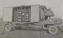 The radar antennas were mounted on a large metal pole extending from the top of the cabin. A complex framework just above the roof allowed the antennas to be rotated vertically, controlled by an arm mounted behind the right parabolic reflector (dish). The two dishes were mounted on either side of the pole, with a gap between them. IFF antennas, if mounted, extended from the two upper rear corners of the cabin. The higher front area of the trailer mounted a generator as well as wooden boxes for storage of spares and tools.