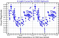 ![]() A visual band light curve showing superhumps of V2293 Ophiuchi, adapted from Masetti et al. (1996)[1] | |