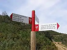 The GR 7 is a long-distance footpath in Spain, Andorra and France. It is part of both the Spanish network of Senderos de Gran Recorrido and the French network of Sentiers de Grandes Randonnées. Part of GR 7 forms the south-westernmost part of the European walking route E4 in Spain. GR 7 runs from Tarifa, near Gibraltar, across Spain, through France into Andorra, and back into France to Mont Aigoual and Aire-de-Côte in the Cevennes.[1] GR 7 continues north from the Cevennes mountains and the final 250 km end on the top of the Ballon d'Alsace, Alsace, northern France; here it meets E5.[1]
