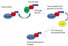 The importance of GAPs comes from its regulation of the crucial G proteins. Many of these G proteins are involved in cell cycling, and as such are known proto-oncogenes. The Ras superfamily of G proteins, for example, has been associated with many cancers because Ras is a common downstream target of many growth factors like FGF, or fibroblast growth factor.[13] Under normal conditions, this signaling ultimately induces regulated cell growth and proliferation. However, in the cancer state, such growth is no longer regulated and results in the formation of tumors.