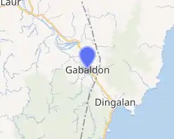 The municipality is located on the valley situated at the footstep of the Sierra Madre Mountains on the east and the Caraballo Mountains on the west.[5] It lies 171 kilometres (106 mi) north-east of Manila. Gabaldon is bounded by the municipalities of Bongabon to the north, Laur to the west, General Tinio to the south, and Dingalan, Aurora to the east.