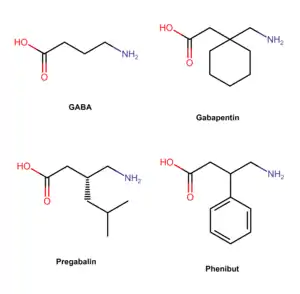 The gabapentinoids are 3-substituted derivatives of GABA; hence, they are GABA analogues, as well as γ-amino acids.[3][4] Specifically, pregabalin is (S)-(+)-3-isobutyl-GABA, phenibut is 3-phenyl-GABA,[15] and gabapentin is a derivative of GABA with a cyclohexane ring at the 3 position (or, somewhat inappropriately named, 3-cyclohexyl-GABA).[36][37][38] The gabapentinoids also closely resemble the α-amino acids L-leucine and L-isoleucine, and this may be of greater relevance in relation to their pharmacodynamics than their structural similarity to GABA.[2][19][36]
