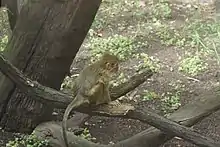 Fruits make up nearly 80% of the Gabon talapoin's diet, favouring plums (Uapaca), figs, umbrella tree (Musanga) and mokenjo (Pseudospondias), oil-palm nuts, and fruits of African ginger (Aframomum).[7] Insects consist of about one third of its diet, mainly consisting of orthopterans, with the occasional beetles, caterpillars and spiders.[12][7] Seeds and leaves form part of their diet as well.[13] Cultivated plantations such as bananas, pawpaws and maize are also attractive food sources for the Gabon talapoin.[7] Near human settlements, harvested cassava tubers soaked in rivers are also sought after by the Gabon talapoins when other food sources are scare.[8][10] Their fruit and insect rich diets also support ecological balance through the dispersion of seeds and maintenance of insect colonies.[10]
