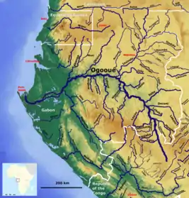 Distribution of the Gabon talapoin is centered around the River Ogooué, native to the equatorial coastal ridges between Cabinda and the Nyong River, and further extends to some Congo River branches.[7] It can be found in Cameroon, Equatorial Guinea, Republic of the Congo and the Cabinda province of Angola.[11] Presence of Gabon talapoin have been documented along the Djérem River in the gallery forest, within the transition zone between the Central African forest block and the Guinea-Congolia/Sudania savannas.[11] The distribution of the Gabon talapoin is thought to be even larger, but not all observations have been confirmed.[11]
