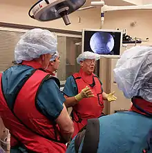In 1982, Racz designed the Racz catheter, a flexible, spring-wound catheter with a small fluoroscopic probe.[17] In 1989, he developed epidural lysis of adhesions, a minimally invasive, percutaneous procedure also known as the "Racz procedure", which is somewhat similar to an epidural.[2] It is used to treat patients with chronic low back pain due to post lumbar surgery syndrome, sometimes called failed back surgery, which involves scar tissue that has formed around the nerve root.[4] It is also used to treat protruding or herniated disks, fractures, degeneration,[18][19] or radicular pain from spinal stenosis, a disease of aging.[4]