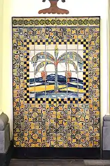 He was a painter, muralist, engraver, photographer, writer, editor, designer and researcher of Mexican handcrafts and folk art.[3] Fernández Ledesma began his career working on projects related to the government, often collaborating or assisting Roberto Montenegro. In the early 1920s, he was commissioned by then education minister José Vasconcelos to create modern tile designs for the church of the former monastery of San Pedro y San Pablo. He chose to revive Puebla Talavera tiles for this task.[2][3][5] In 1922, he went to Rio de Janeiro as an assistant to Montenegro to design the murals that decorated the walls of the Mexican pavilion for the 1922 Centenary Exposition in Rio de Janeiro .[3][5] When he returned from Brazil, education minister José Vasconcelos, appointed him artistic director of the Ceramics Pavilion at the faculty of Chemical Science.[3]