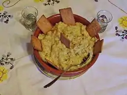 Gachas is considered an unrefined rural dish, the food of shepherds, farmers and itinerant labourers. It has been also described as a "fundamental Gitano dish".[1] The gachas have largely been ousted by rice and potato dishes in most areas of Spain during the 20th century, especially in the towns and cities. Consumption of this simple dish resurfaced again during economic downturns and upheavals, like the Spanish Civil War, earning it the name gachas de los años difíciles (gachas of the hard years). Certain modern chefs argue, though, that well-prepared gachas are not necessarily a coarse dish.[2]