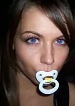 A pecker or penis gag is a gag that has a bulge resembling a phallus (erect penis) or a nipple that is placed into the mouth to enable the wearer to suck on it in a manner similar to an adult pacifier. The use of a phallic shape is intended to give it an erotic connotation, but it may be a large knob — similar to a ball gag — or may be inflatable. The pecker gag may be wide and flat and large enough almost to fill the mouth, intended to depress the tongue.