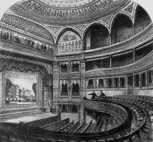 In 1868, the theatre was sumptuously rebuilt by John Hollingshead as the Gaiety Theatre (announcing its dramatic policy in its name), on a nearby prominent site at the centre of the Aldwych, facing the eastern end of the Strand.[3] It was designed by the theatre architect C. J. Phipps, who also designed the Gaiety Theatre (1871) in Dublin. A restaurant operated in the building, and patrons could eat before seeing the show and then go directly to their seats without having to worry about the weather outside.