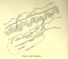 Polybius gives a detailed description of the events of the battle, particularly the death of Hasdrubal and the strategy used by Claudius to seize the overall victory.[42] Hasdrubal was followed by Roman legions led by Claudius as he was attempting to meet up with his brother Hannibal in Italy.[41] Hasdrubal sent out messengers outlining the meeting point, these despatches were intercepted by the Romans, providing them with the means to adopt an offensive approach now they knew the plans. Claudius had been camped close to Hannibal, in a strategic position. He was stationed further south than his colleague and co-consul M. Livius Salinator, and set off to march north to join Livius and eventually reach Hasdrubal near the Metaurus River.[43] He left most of his army to keep watch, and joined up with Livius at night. After Hasdrubal realised there were two Roman consuls in the same camp, he decided to retire until he could make contact with his brother. Claudius was commanding from the right wing of the Romans, however was obstructed by a ravine and couldn't get around. Ingeniously Claudius marched his troops behind the Roman lines to emerge in a surprise attack behind Hasdrubal's forces.[42] Livy described this battle as a disaster for the Carthaginians, with around 56,000 troops dead.[44]