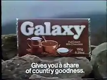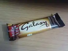 Galaxy is a chocolate bar, made and marketed by Mars Inc., and first manufactured in the United Kingdom in the 1960s.[1] Galaxy is sold in the United Kingdom, Ireland, South Africa, the Middle East, Morocco, India, Pakistan, Malta,[2] and is also sold in the United States, Canada, Mexico and various Continental European countries as Dove. In 2014, Galaxy was ranked the second-best-selling chocolate bar in the UK, after Cadbury Dairy Milk.[1]