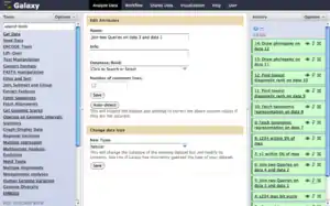 - As a free public web server,[18] supported by the Galaxy Project.[19] This server includes many bioinformatics tools that are widely useful in many areas of genomics research. Users can create logins, and save histories, workflows, and datasets on the server. These saved items can also be shared with others.