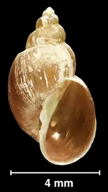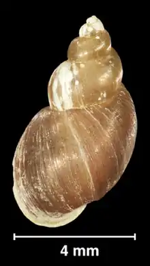 The shell is brownish to reddish light brown, thin-walled, elongated conical, usually with four regular convex whorls and up to 5.5 whorls in the longer specimens.[4] The whorls are somewhat inflated, slightly shouldered, with silky and longitudinally striated surface and separated by a deep, well-marked suture, increasing rather slowly in diameter.[4] The columella is straight, unfolded, and the umbilicus is open.[4] The last or body whorl is almost ¾ times as high as the shell height, presenting a slight twisting trend along its basal part visible in the biggest shells when viewed dorsally, and which is due to the enlargement of the basal lip of the peristome (in the way of Pseudosuccinea columella).[4] The spire is pointed.[4] The aperture is elongatedly oval, slightly oblique, mid-sized and wider at the base.[4] The thin peristome is patent throughout, the umbilicus is partially covered by a widened columellar lip.[4] The shell shows a tendency to be approximately one and a half to two times as long as it is wide, and its aperture tends to be slightly less than half as long as the shell.[4] The width of the shell is 1.39–4.31 mm.[4] The height of the shell is 2.41–8.06 mm.[4] The width of the aperture is 0.77–2.66 mm.[4] The height of the aperture is 1.16–4.12 mm.[4]
