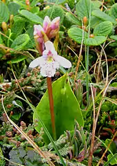 Galearis rotundifolia is a succulent perennial herb growing from a fleshy rhizome. It reaches a maximum height around 33 centimeters. A single leaf clasps the base of the stem. It is variable in shape and size, reaching up to 11 centimeters in length. The inflorescence is a spike of flowers and leaflike bracts occupying the top of the stem.[3] The plant produces up to 18 flowers at a time.[4] The flower has six tepals in shades of white or light magenta; three are sepals up to a centimeter long, and three are shorter, narrower petals. The spurred, lobed lip of the middle petal is white with magenta spots and sometimes bars. Flowers bloom June to July. There are two pollinaria, which bear the sticky pollen. The fruit is a capsule.[3]