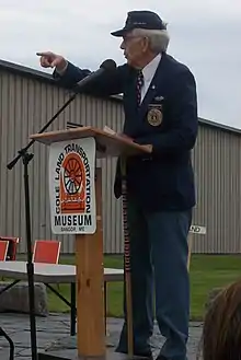 ![]() Cole at the Cole Land Transportation Museum addresses a group of students from Maine School Administrative District 63 in 2007. | |