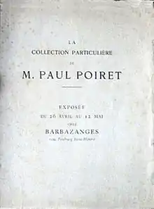 - 1923: 26 April – 12 May. Art collection of Paul Poiret. Much of this would be auctioned in November 1925 at the Hôtel Drouot due to Poiret's bankruptcy.[14]