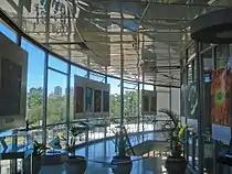 The building has five floors, six staircases and a 20 metres (66 ft) diameter room with 360 seats. The inside of the 20m semispherical dome is covered with reflective aluminium.