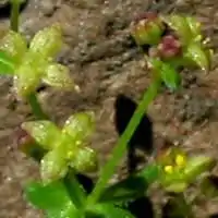 Galium nuttallii is a climbing perennial herb producing a woody base and sprawling with thin, hanging green to red branches up to 1.5 meters long. The stems have whorls of four tiny sharp-pointed leaves at intervals, each leaf under a centimeter long. The plant is dioecious, with male and female individuals bearing different flower types. Both flowers are reddish, and the female flower ovary turns into a berry.[5][6][7][8]