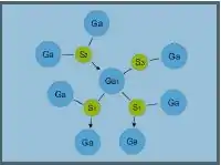 The structure of Ga-La-S glass consists of Ga-S bonds, with a length of 2.26 Å, and La-S bonds of length 2.93 Å. It has been reported that the Ga-S bond lengths in the glassy state are identical to those in the crystalline state.[4] Therefore, it is only necessary to change the bond angles and, thus, it is hypothesised that Ga-La-S has the potential to be a fast switching phase change memory material. In the Ga2S3 crystal shown in (figure 2 below) it should be noticed that two out of three sulfur atoms (S1 and S2) are each bound to three gallium atoms. These sulfur atoms have two normal covalent bonds to two of the gallium atoms. The third Ga-S bond is dative or coordinate covalent (one of the atoms provides both electrons). The third sulfur atom, S3, is bound to just two gallium atoms and is thought to be a bridging atom. The average sulfur coordination number is greater than two; sulfide glasses usually have coordination numbers less than two. Experimentally, Ga2S3 has not been observed in a glassy state. There exists however a GaS4 unit within the Ga-S crystal which has been noted as the glass former. The La-S bond is ionic and likely to be a network modifier. By adding an ionic sulfide to the crystal, like La2S3, it is possible to modify the crystalline Ga2S3 into a vitreous structure. Of all the rare-earth sulfides, lanthanum gives the largest range of vitreous compositions. The effect of adding an ionic sulfide modifier such as a La2S3 molecule to the crystal is to break one of the Ga-S dative bonds and replace it with a S2− anion. This anion links the gallium atom such that its tetrahedral environment is not altered, but what was a tricoordinated S atom now becomes a dicoordinated bridging atom. This process creates a negative void which can then be filled by a La3+ cation. Electrically, the effect of adding La2S3 is to give the glass an essentially ionic character.[4]