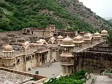 Galtaji is an ancient Hindu pilgrimage about 10 km away from Jaipur, in the Indian state of Rajasthan. The site consists of a series of temples built into a narrow crevice in the ring of hills that surrounds Jaipur. A natural spring emerges high on the hill and flows downward, filling a series of sacred kunds (water tanks) in which pilgrims bathe. Visitors and pilgrims can ascend the crevasse, continuing past the highest water pool to a hilltop temple from there are views of Jaipur and its fortifications spreads out across the valley floor. It is believed that a Saint named Galav lived here, practiced meditation, and did penance (tapasya).[1]