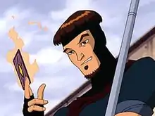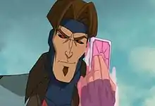 Gambit was a guest character in Wolverine and the X-Men, in which he was portrayed as a freelance thief and saboteur for hire. His first appearance was in the episode "Thieves Gambit" voiced by Phil LaMarr.[1][2] He first appears as a thief for hire, who steals a mutant ability-neutralizing collar invented by Forge and sells it to Dr. Sybil Zane and Bolivar Trask to use in the Sentinel Program. Wolverine convinces him to help him retrieve it, though he later escapes the fight without the collar. He appears again in the twenty-second episode, "Aces and Eights," romantically charming and seducing Polaris with his hypnotic charm ability, and attempting to steal Magneto's helmet, as well as placing explosives to damage Genosha's facilities. At the end of the episode, he leaves Polaris, stating that he is not the man she thinks he is and that this is the way the world is; however, he was not seen for the rest of the season. Like in earlier X-Men-related cartoons, Gambit has a strong Cajun accent and wears the usual body armor and coat. His romantic relationship with Rogue was not seen, as well as whether or not he was going to be a regular X-Men team member in the second season.[3]