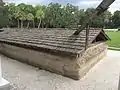 The Gamble Mansion was built principally by enslaved people, both laborers and artisans, using local materials over the course of five to six years.[5] The mansion is an outstanding example of antebellum construction in the Doric Revivalist vernacular architectural style. The mansion's columns and two-foot-thick walls are made of tabby, a unique type of concrete first used by Spanish and English settlers on the Atlantic coast and Sea Islands as an alternative to clay bricks, which could not be produced due to a lack of clay in the coastal soil. Techniques for making tabby were brought to Florida by European-American planters and the African-American people they enslaved. The workers created the material by mixing lime (extracted by burning crushed oyster shells), more crushed oyster shells, sand, and water. The mixture was poured into molds for hardening, and the finished product was used in the same manner as bricks. Ample supplies of oyster shells were found in middens present on the sites of former Native American coastal villages.