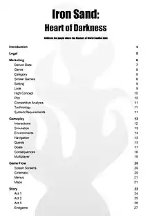 Game developers may produce the game design document in the pre-production stage of game development—prior to or after a pitch.[5] Before a pitch, the document may be conceptual and incomplete. Once the project has been approved, the document is expanded by the developer to a level where it can successfully guide the development team.[1][6] Because of the dynamic environment of game development, the document is often changed, revised and expanded as development progresses and changes in scope and direction are explored. As such, a game design document is often referred to as a living document, that is, a piece of work which is continuously improved upon throughout the implementation of the project, sometimes as often as daily.[2][7][8][9] A document may start off with only the basic concept outlines and become a complete, detailed list of every game aspect by the end of the project.