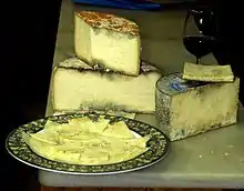 Gamonéu cheese (Spanish: Queso de Gamonéu or Queso de Gamonedo. Asturian: Quesu Gamonéu) is a fatty Spanish cheese made in certain parts of the Principality of Asturias. Taking its name from the village of Gamonéu where it was originally made, Gamonéu cheese has a Protected Designation of Origin. It is a lightly smoked cheese with a thin, natural rind that is coloured brownish with some red, green and blue patches. Moulds on the rind slightly invade the interior of the cheese. Similar to other cheeses in the region, Gamonéu is made from a combination of cow, goat and sheep milks. Gamonéu cheese is sold in the form of cylinders with flat ends in weights varying between 500g (18 oz) to 7 kg (15 lbs). Gamonéu comes in two distinct forms: "del Puertu", which is made in the high passes and "del Valle", which is made in the lower valleys. Gamonéu del Puertu is harder and drier and is the rarer of the two forms as production is limited to the summer months in the uplands. Gamonéu del Valle is richer and creamer and production continues year-round. [1]