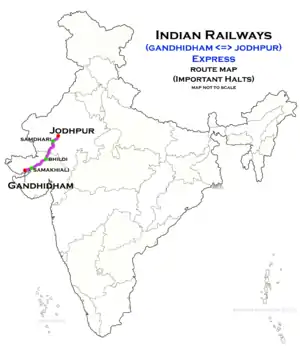 The 22483/22484 Gandhidham–Jodhpur Express is a Superfast train belonging to North Western Railway zone that runs between Gandhidham Junction and Jodhpur Junction in India. It is currently being operated with 22483/22484 train numbers on tri-weekly basis.[1][2]