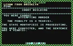 Each player tries to get promoted from punk to Godfather by purchasing a gun and attempting to murder someone.[2] If convicted, the "state mouthpiece" will sentence the player to four years in prison. For each subsequent sentence, the sentence is doubled unless a pardon can be purchased from the "state mouthpiece". Players can purchase trucking unions, prostitutes that are all assigned with the code name Betsy, and moonshine operations.[2] Limousines can be stolen from other players who already have them, with a certain degree of risk.[2] Betting on horse racing events can play a role in adding valuable dollars to the player's bank account.[5]