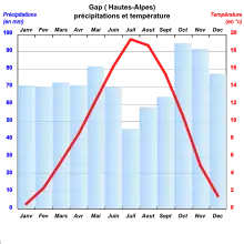 Gap features an oceanic climate (Cfb), according to the Köppen system, with continental (Dfb) influence due to its elevation. Very influenced by its interior position, the city experiences cold, snowy winters and warm summers. Therefore, the climate is more or less alpine.
