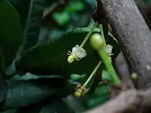 It is an evergreen small tree, growing to 6–18 m tall. The leaves are borne in opposite pairs or whorls of 3–4, each leaf blue-green, oval, 6–11 cm long and 3–5.5 cm broad. The flowers are produced in clusters on the stems. The fruit is a small, bright, orange, thin-skinned berry 1–4 cm diameter, with one single large seed; the small yield of edible fruit is pleasantly sweet, yet acidic, but also containing a latex that some people find unpleasant.[3][4]