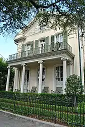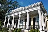 - Claiborne Cottage, 2727 Prytania Street, a raised, center-hall, Greek Revival cottage, built in 1857 by John Vittie for Sophronie Claiborne Marigny, daughter of Louisiana's first Governor, Lady of French Queen Amelie's court, and wife of Mandeville de Marigny, a prominent political and military figure. After several subsequent owners, the Society of Redemptorists purchased the cottage in 1923 with the intention of building a church in its place. Instead, the structure served as Bon Secours Grammar School 1923–1925, Redemptorist High School 1925–1929, Sisters of Mercy Convent 1929–1953, and Provincial House of the Redemptorist Vice Provincialate 1953–1955. The house was restored as a private residence in 1980. In 1995 it was acquired by the Rice family. (Marker by Orleans Parish Landmarks Commission, 1995)[14]