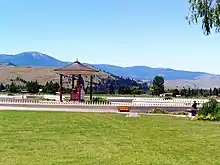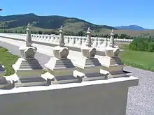 The garden's center is for ceremonial gatherings, and has been used as a venue for mass or individual prayer, speeches, musical performances,[11] and shared spiritual practices with the local Salish-Kootenai people.[13] A 2011 interview[10] quoted tribal officials as grateful for the open and nondenominational nature of the garden, a welcome difference from other immigrant cultures which have been allowed to purchase tribal land because of a 1910 act that permits non-tribal settlement.[14] Certain similar beliefs, and a shared history of persecution in their native lands have been described as uniting factors between the Buddhists and people of the Confederated Salish Kootenai Tribes.[10][15] Sang-ngag himself was imprisoned during the Chinese Invasion of Tibet for ten years.[16]