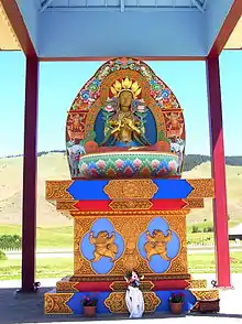 The deity Prajnaparamita represents the pinnacle of an enlightened woman: a yogini who has, through mastery of wisdom, become a dakini, or female supernatural being.[8] She advocates wisdom through realization of the "empty," or ephemeral nature of the sensual world. She is also known as Yum Chenmo, Mahamaya, Prajnaparamita (the symbolic mother of all Buddhas), and is associated with the Hindu concept of Shakti.[9] Her statue features an ornamental base with traditional Buddhist motifs and is twenty-four feet tall.[10]