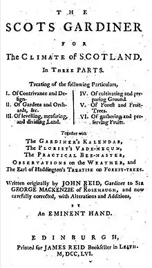 Gardening books from the continent and England became widely available in this period and the first gardening book was published in Scotland.[2] This was John Reid's, Scots Gard'ner (1683). Reid had been gardener at Niddry Castle, Hamilton Castle, and Drummond Castle and for George Mackenzie of Rosehaugh.[11][12] The book borrowed from John Evelyn's (1658) translation of Nicholas de Bonnefon's Le jardinier françois (1651), adapting its ideas for Scottish conditions.[2]